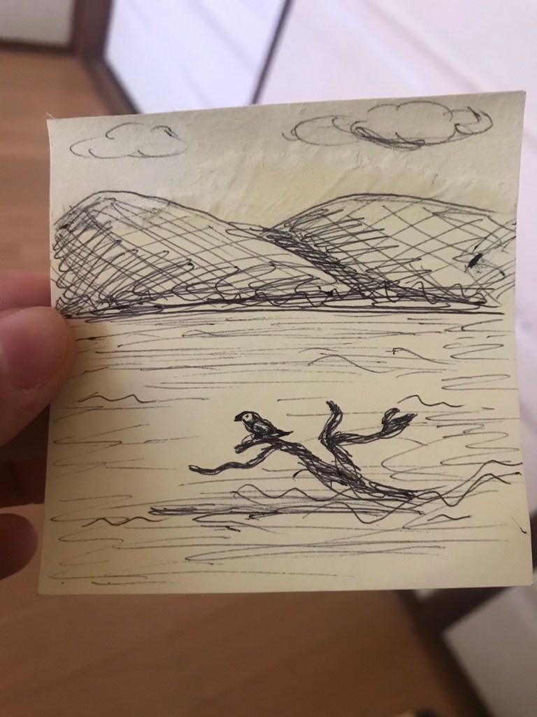The connection of everything in that small window of time was so special. Although I had been taking nature photos throughout my walk and was tempted to take a photo of the bird, I didn’t. The revelation of the moment felt sacred and deserved reverence. (I drew this photo to illustrate the scene.)